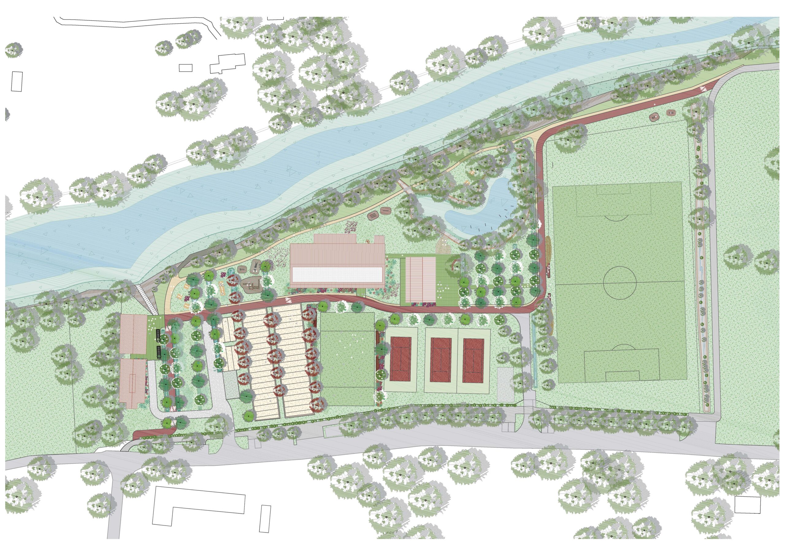 Le site existant, en bord de l’Isle, comprend une base de kayak, un terrain de football, un gymnase, quelques courts de tennis et un terrain omnisport. Le projet, pensé avec Asné Architecture et Michel Apard se structure autour de partis-pris clairs : retrouver un paysage fluvial, structurer les mobilités et les usages, et fédérer par l’architecture.
