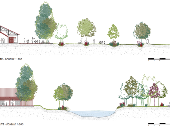 L’objectif principal de l’aménagement est de renouer avec l’Isle : une stratégie de renaturation prévoit ainsi un dialogue avec le paysage fluvial, par la création de fenêtres végétales cadrant les vues, la plantation d’un maillage bocager et la création de noues paysagères pour désimperméabiliser et gérer les eaux pluviales.