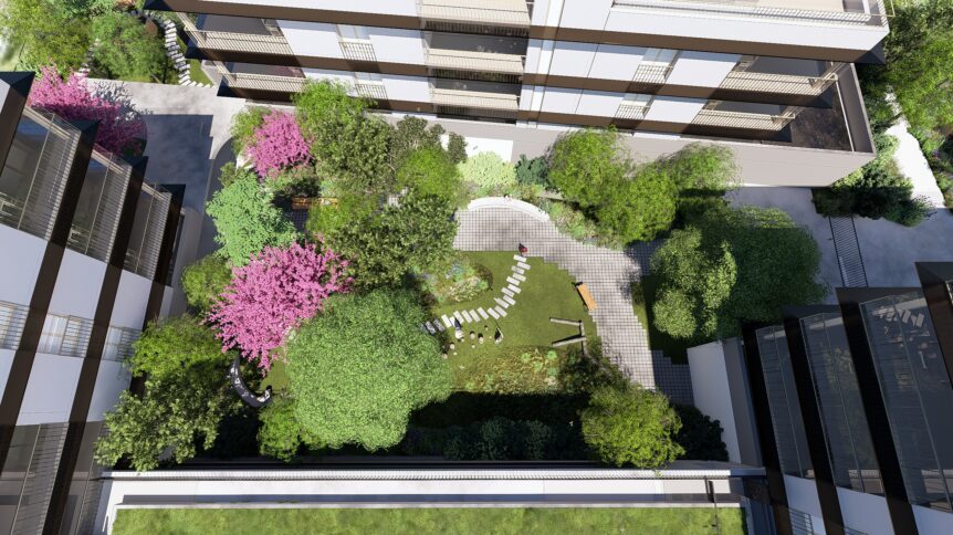 L’esplanade et le parvis assurent l’accès aux commerces et aux livraisons tout en intégrant un espace planté généreux, grâce à de larges fosses de plantation et à une ouverture paysagère vers le cœur d’îlot. Conçu comme un paysage frais et forestier, ce coeur d’îlot offre une véritable diversité écologique et une gestion optimisée des eaux pluviales.