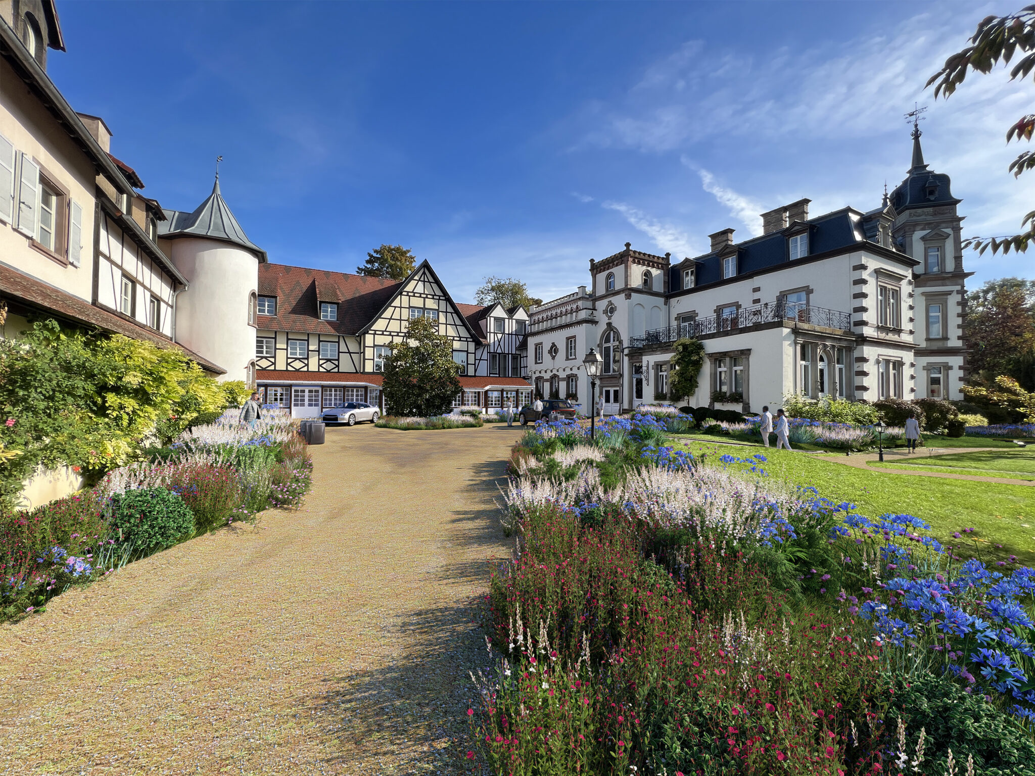 Les essences choisies privilégient la diversité et la saisonnalité : arbres d’ombrage aux houppiers généreux, sous-étage arbustif coloré et vivaces