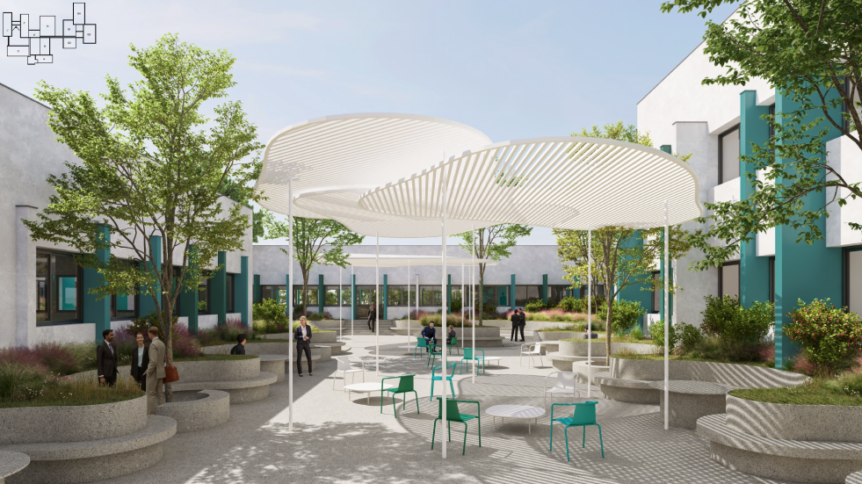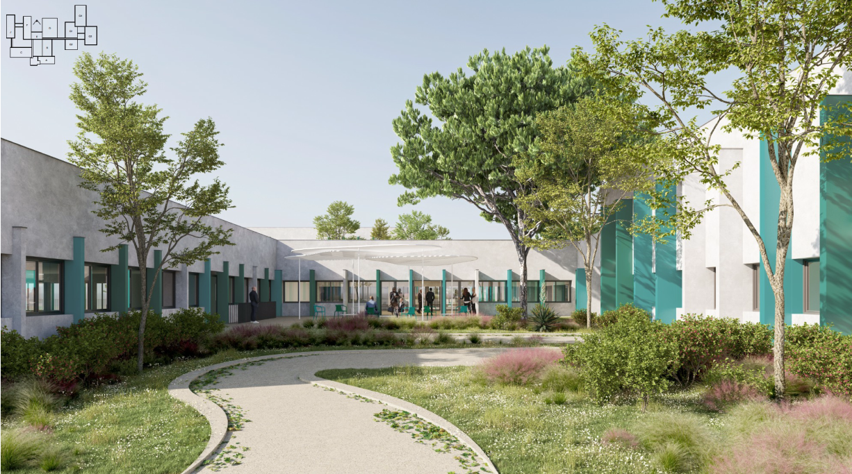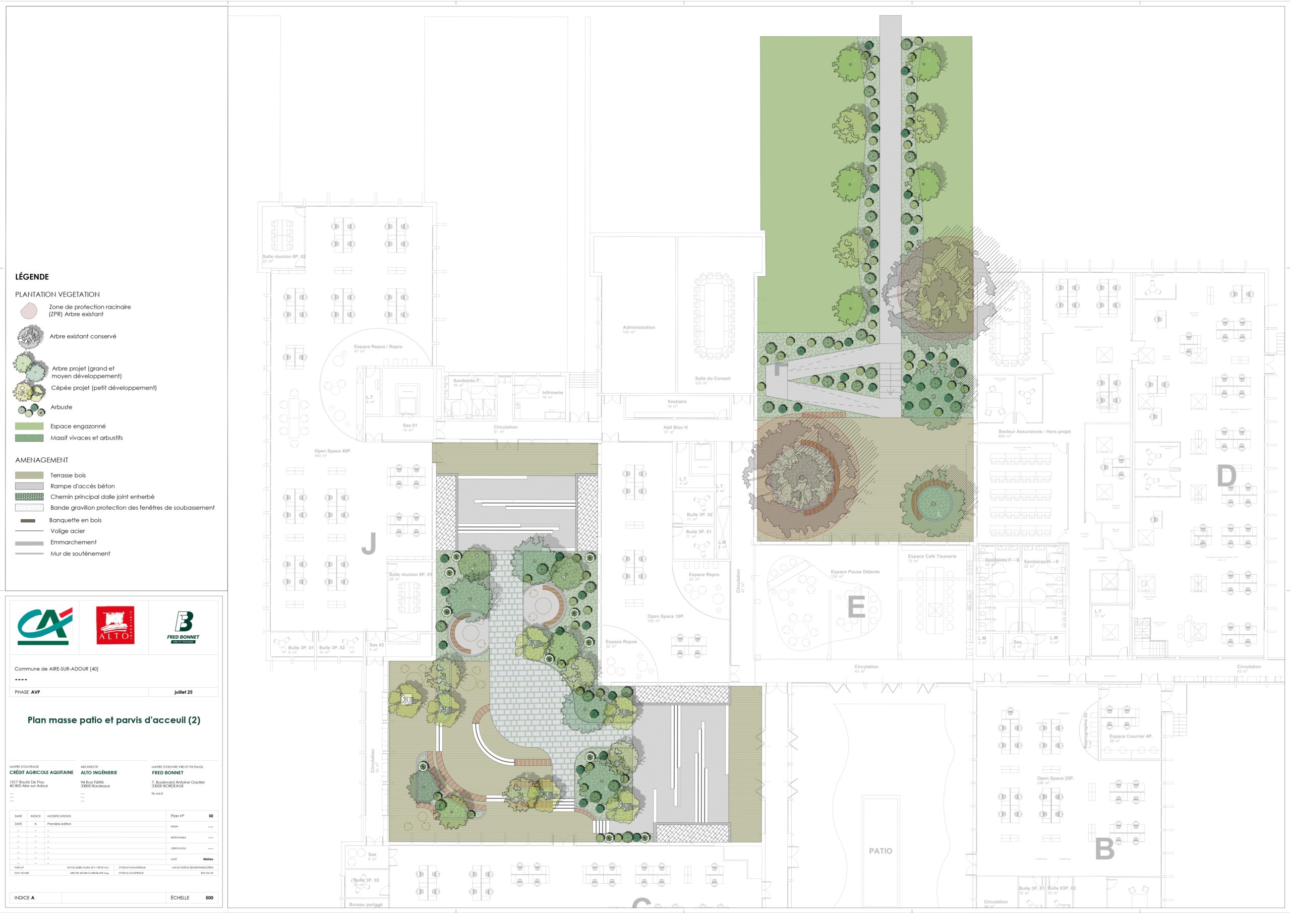 travail extérieurs et des espaces de rencontre. Le parvis d’entrée s’organise autour d’une rampe d’accès fluide et de fosses de plantation ponctuées