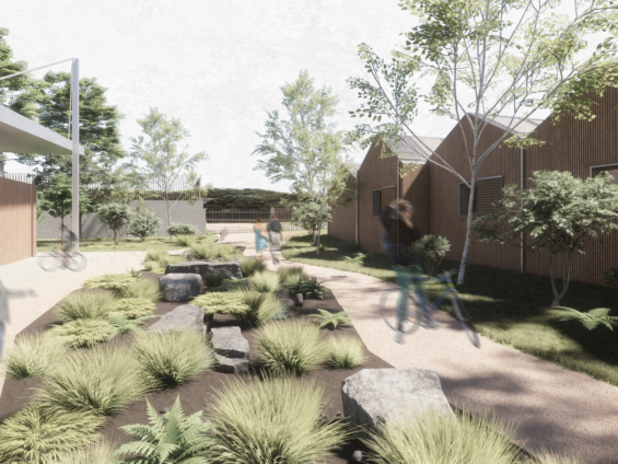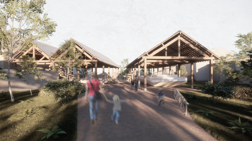 Le projet vise la reconversion d’un délaissé urbain, ancienne friche artisanale, en un site écotouristique intégré au paysage et connecté à la Flow Vélo. Pensé comme une halte pour les itinérants, l’aménagement propose une offre d’hébergements légers et pluriels – tentes et tiny houses – complétée par des services adaptés aux usagers de l’itinéraire cyclable, notamment un espace de réparation et d’accueil des vélos.