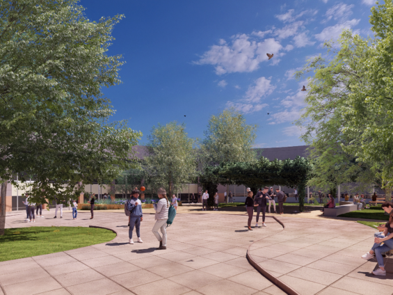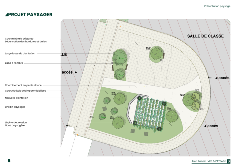 Les arbres existants sont conservés, et la plantation de nouveaux arbres vient renforcer l’ombrage et accueillir la biodiversité. L’introduction de trois strates végétales (vivaces, arbustes, grimpantes et arbres) diversifie les ambiances, tandis que la pergola végétalisée enrichit l’ensemble et apporte un confort climatique. Des dispositifs d’assise variés (bancs, murets et tables) favorisent la convivialité. Le projet maintient un espace de regroupement pour des usages collectifs.