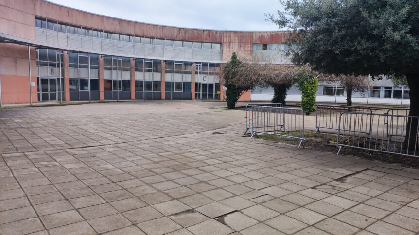La cour du lycée, aujourd’hui largement minéralisée, présente une végétation insuffisante et peu fonctionnelle : deux jeunes chênes verts (Quercus ilex) encore en croissance, trois cyprès à port fastigié sans ombre efficace et un revêtement 100% minéral.